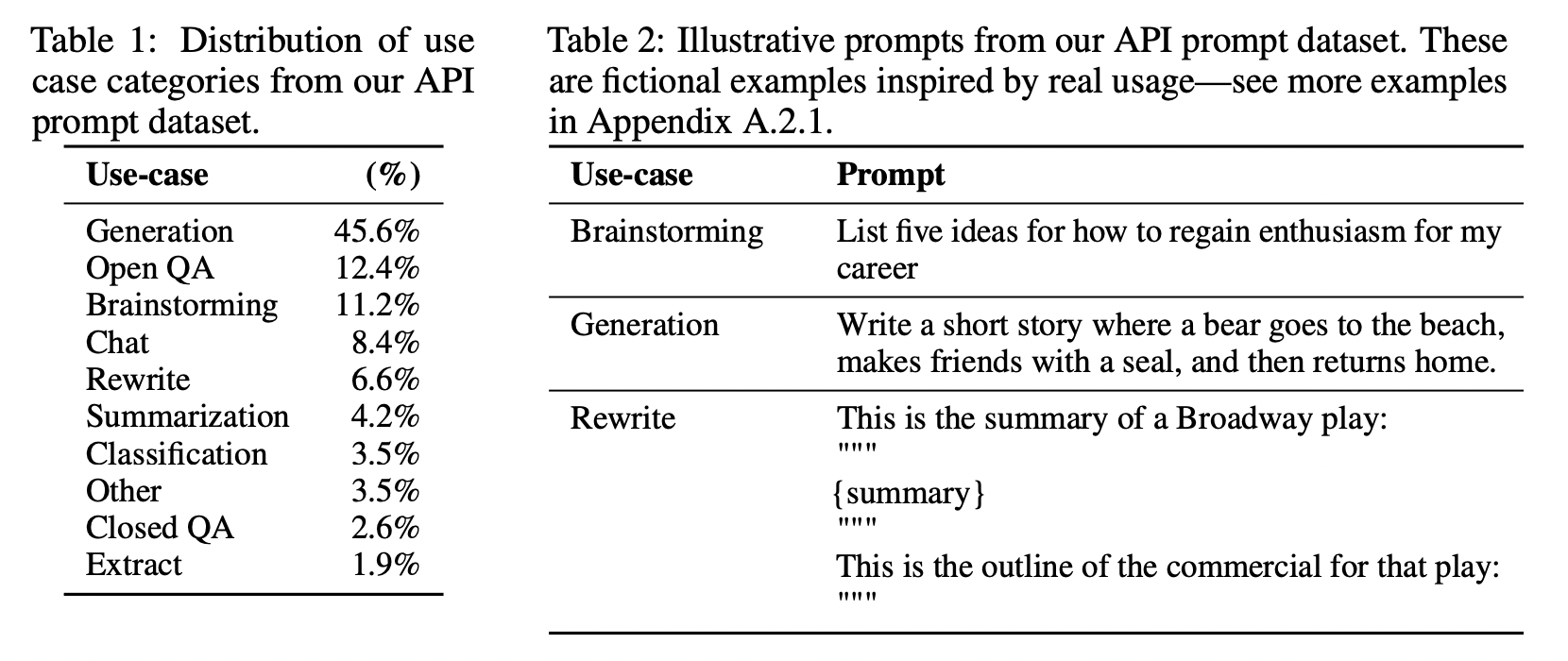 데이터 수집을 위해 40명의 라벨러들을 선정하여 주어진 prompt에 label, 즉 응답을 하도록합니다. 주어지는 prompt 데이터셋은 다음과 같은 직접적인 지시문과 few-shot을 통한 지시문이 섞여있고, 생성, 질의응답, 브레인스토밍, 요약 등 다양한 task를 수행하도록 하는 use-case로 이루어져 있습니다.