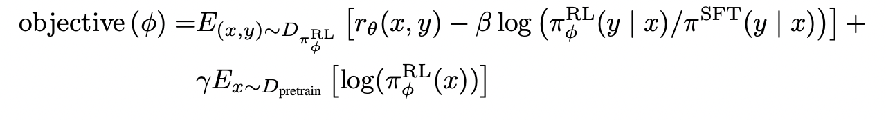 InstructGPT를 훈련시키기 위해 본 연구에서는 강화학습 방법 중 하나인 PPO(Proximal Policy Optimization) 알고리즘을 사용했습니다. PPO는 이전에 적용된 정책에서 너무 크게 벗어나지 않도록 새로운 정책을 업데이트하는 방법을 제공하는 것이 특징입니다. 이를 통해 모델이 이전에 학습한 정보를 완전히 잃지 않으면서도 새로운 정보를 학습할 수 있다는 장점이 있습니다. 또한, SFT모델에서 각 토큰에 대한 KL penalty를 추가하여, RM의 과적합을 방지하도록 합니다. 이렇게 훈련 모델들을 페이퍼에서 'PPO'라고 부릅니다. 강화 학습 훈련 시 사용된 목적 함수는 다음과 같습니다.