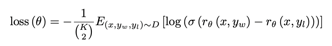 보상 모델의 loss function은 이렇게 표현될 수 있습니다. prompt x에 대한 응답 쌍 ($y_w$, $y_l$)이 있고, $y_w$(win)는 선호도가 더 높은 응답을 의미합니다.