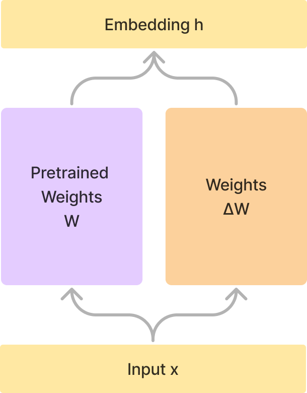 일반적인 fine-tuning 과정에서는 전체 가중치 행렬(W)에 대해 업데이트(ΔW)를 직접 수행합니다. 이는 모든 가중치를 계속 업데이트하고, 이를 원래의 가중치에 더하는 것을 의미합니다. 그러나 이 방법은 많은 계산량을 요구하고 거대한 가중치를 저장해놓아야하기 때문에 비효율적이라는 단점이 있습니다.