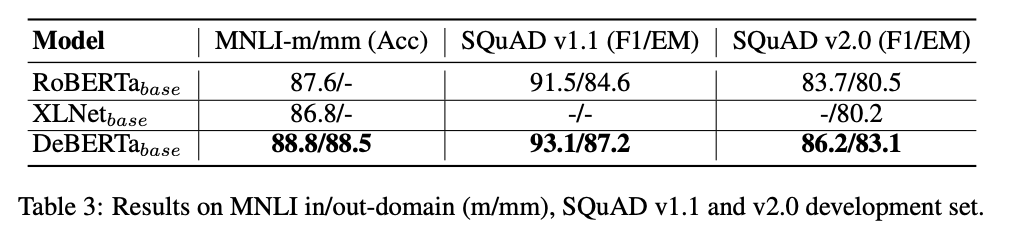 - (DeBERTa) content와 relative position에 기반한 disentangled matrices를 사용하여 연산 → “한 단어의 어텐션 가중치는 content 뿐만 아니라, relative position에도 의존”